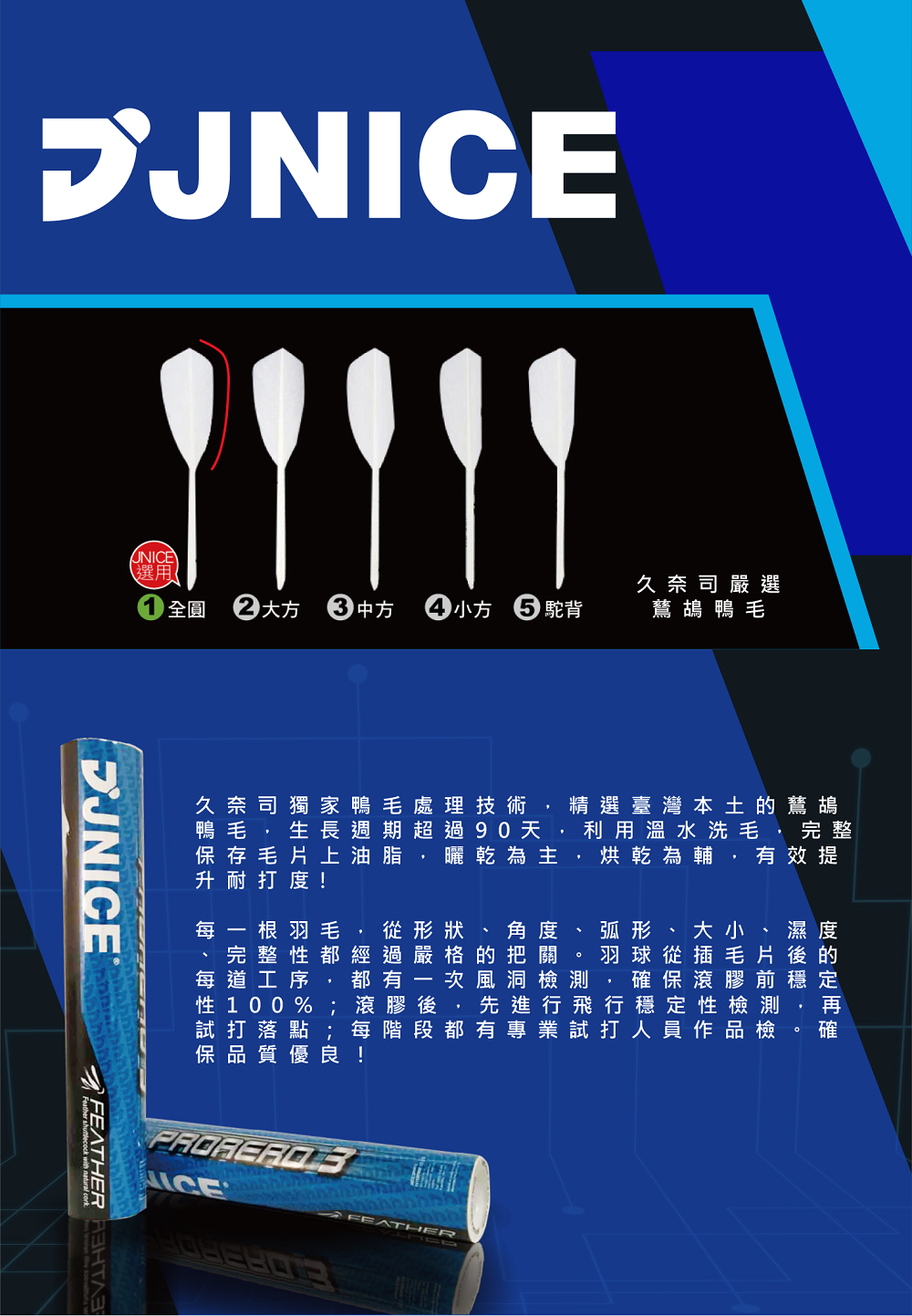 社會球隊比賽首選羽毛球;頂級乾拔鴨毛,溫水洗滌、曬乾為主、烘乾為輔,完整保留毛片上的油脂,有效提升耐打度!嚴密的風洞檢測、飛行穩定性、打落點測試,每階段都有專業試打人員品檢,保障優異品質。