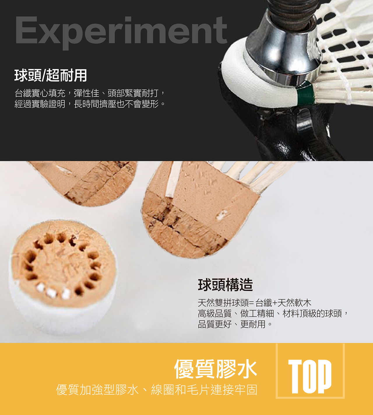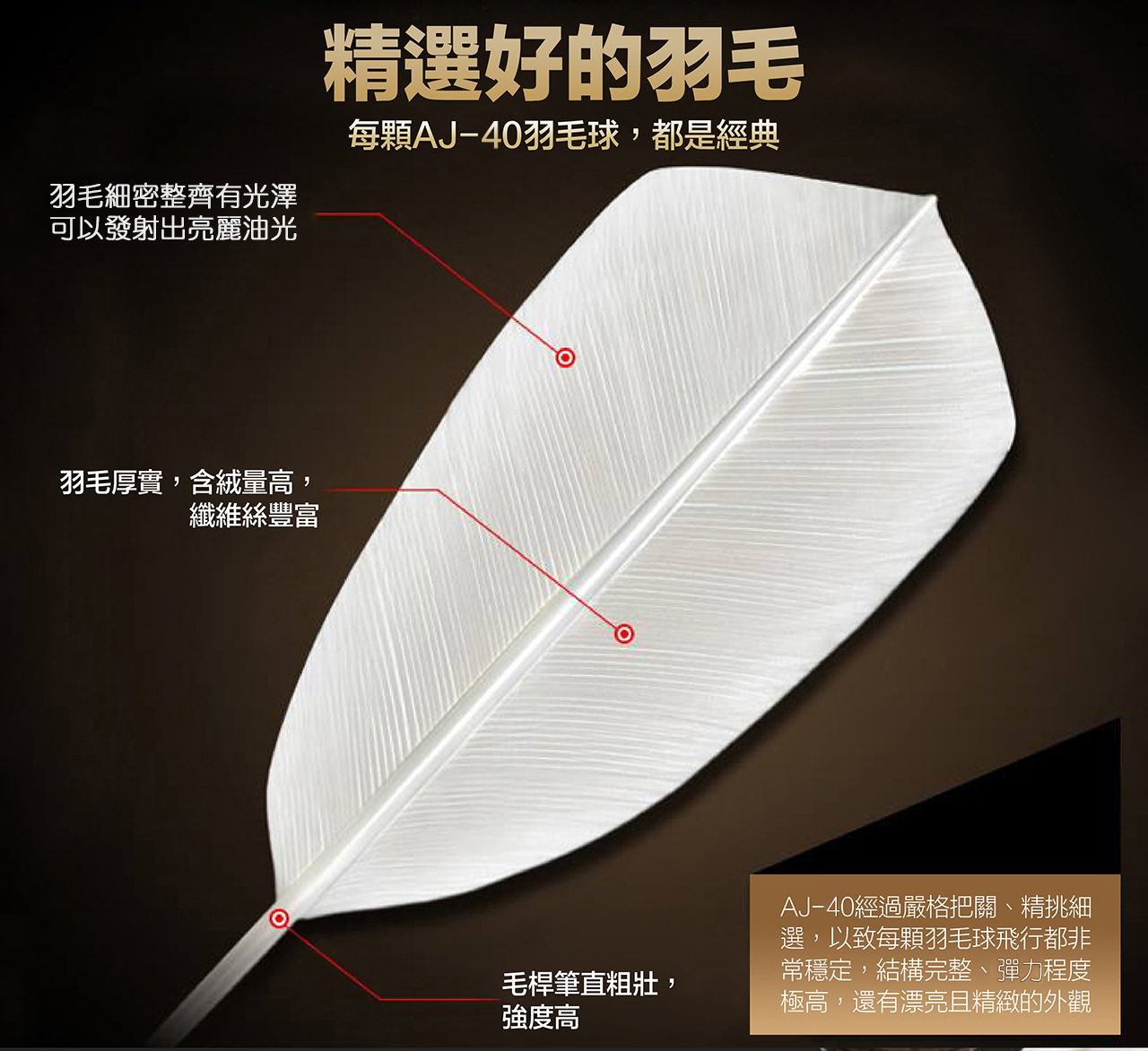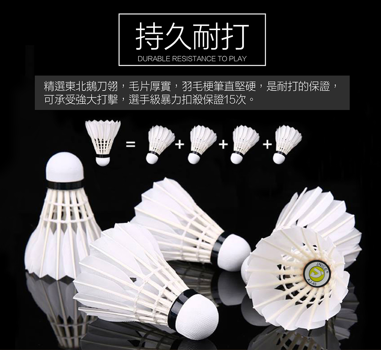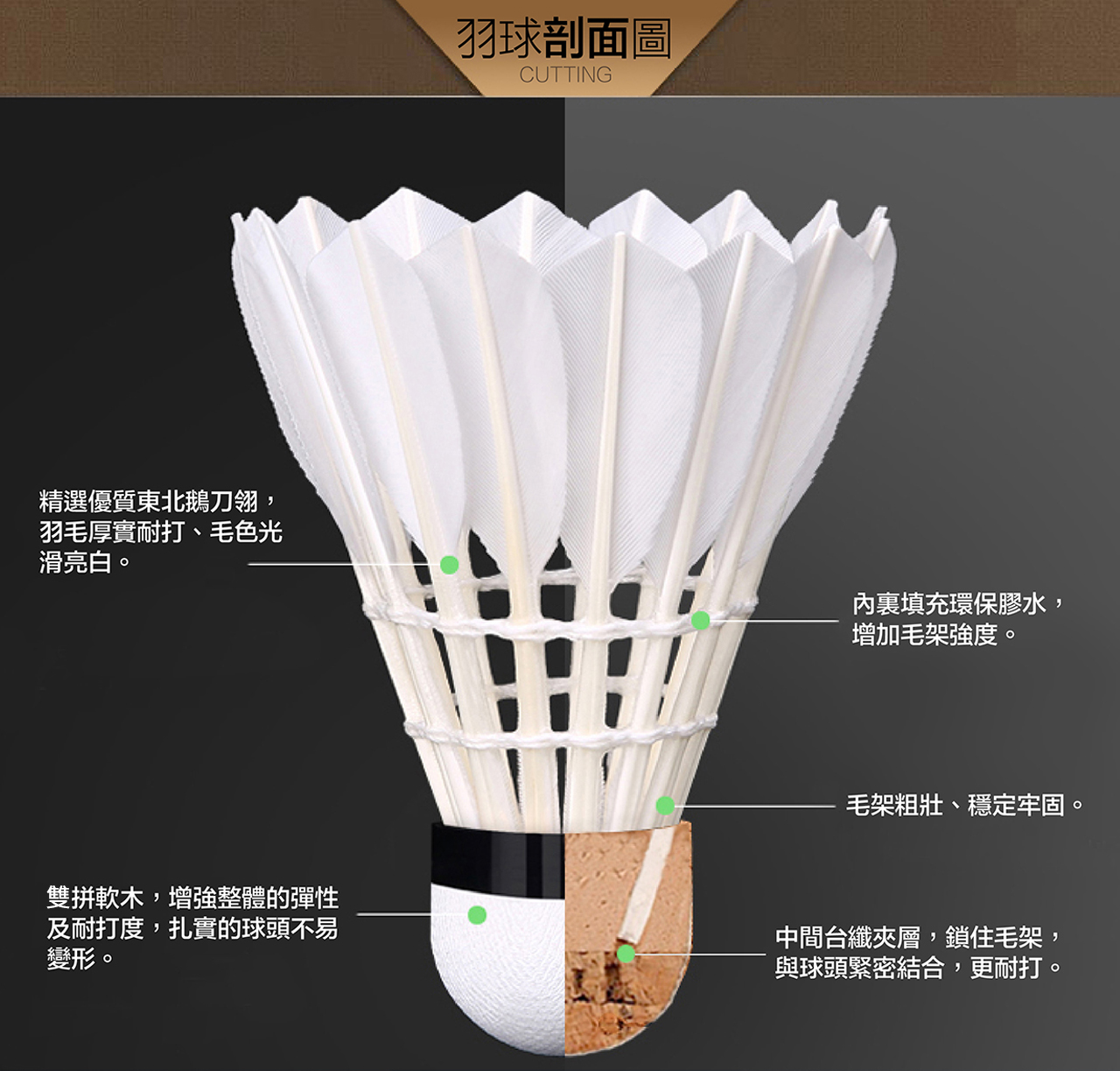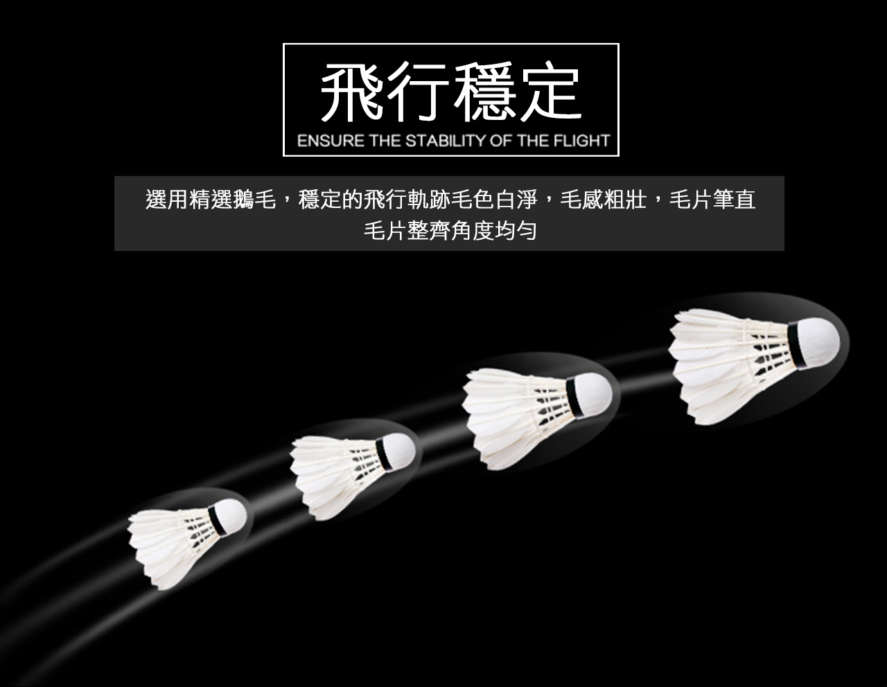 各級比賽指定用球,上等全圓鵝刀翎,羽毛含絨量高、毛梗筆直堅挺,搭配天然雙拼球頭,緊實耐打、彈性好、飛行穩定。