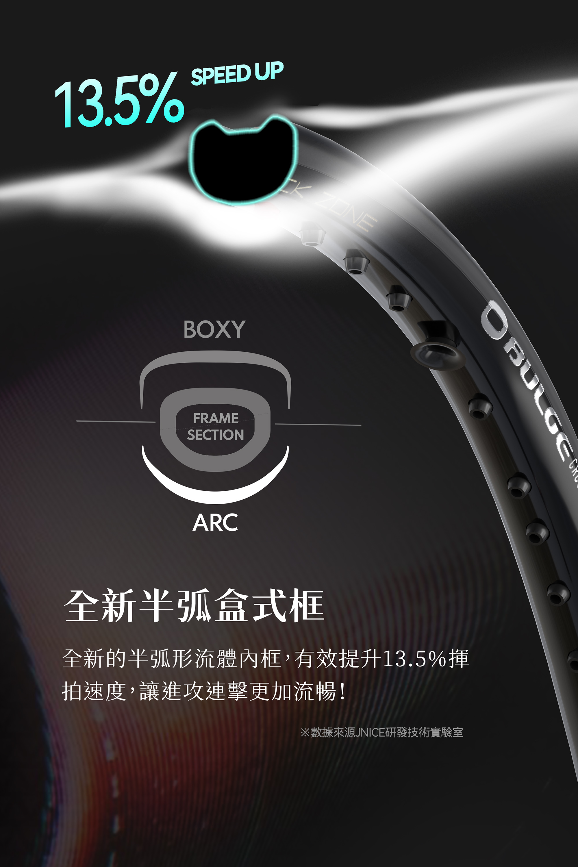 全新半弧盒式框,有效提升13.5%揮拍速度