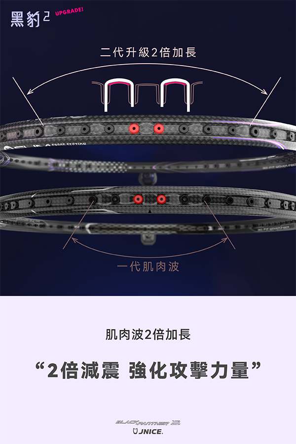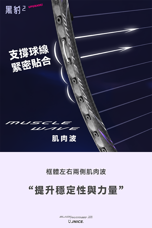 除了結構核心,Jnice 黑豹二也導入創新的 肌肉波導軌設計,加強拍框擊球時的力道集中。